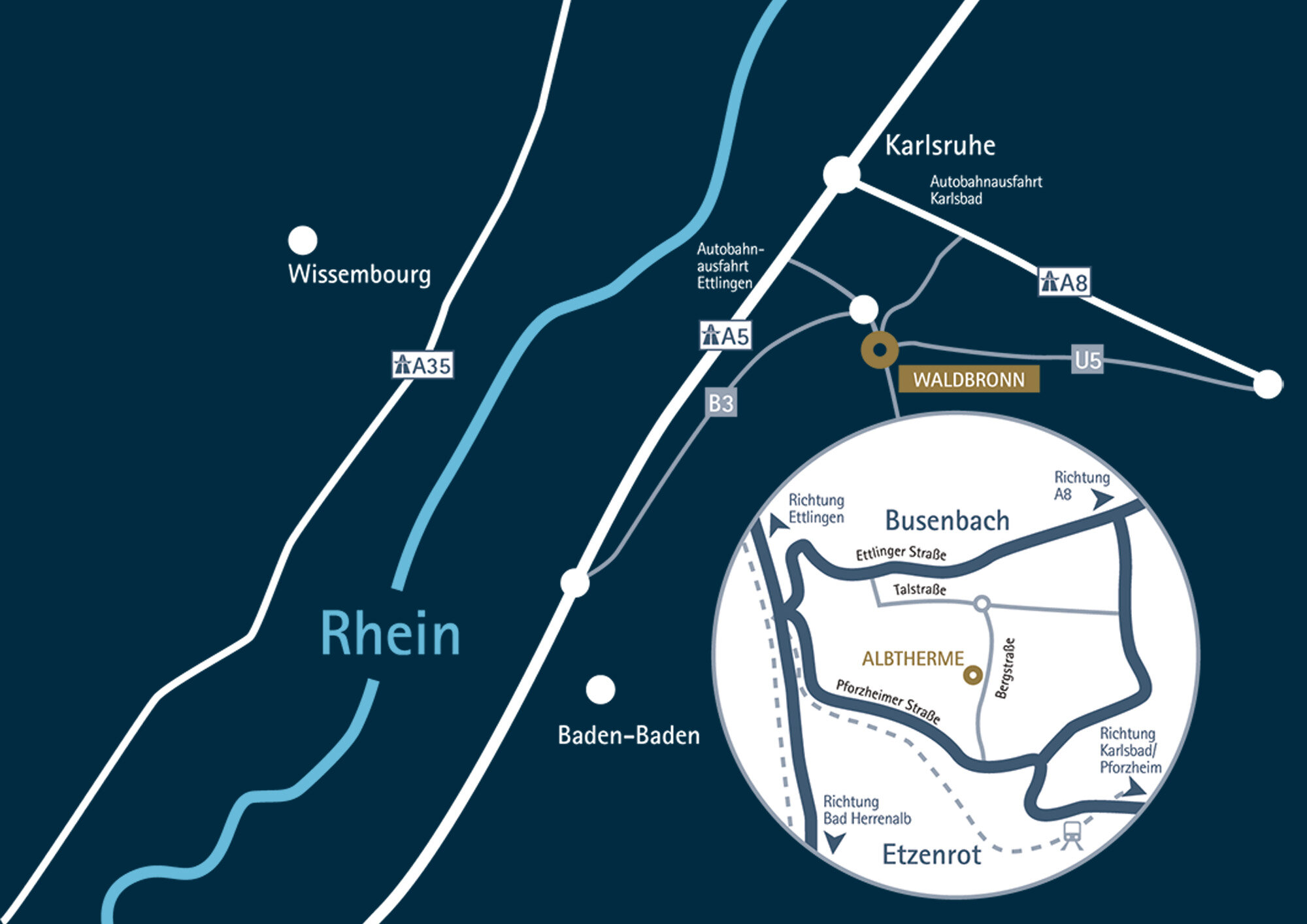 Avec la Deutsche Bahn jusqu'à la gare centrale de Karlsruhe, puis continuer avec la ligne de S-Bahn S1 ou S11 jusqu'à Waldbronn-Busenbach (ou avec S11 jusqu'à Waldbronn-Reichenbach). De là, vous pouvez soit prendre le bus 115 directement jusqu'à l'arrêt Albtherme.